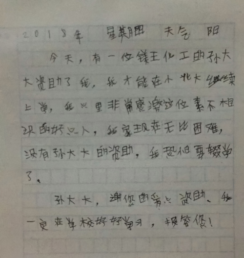 當(dāng)年8月份,紀(jì)某某和賈某某兩位學(xué)生分別以優(yōu)異的成績考入石家莊鐵道學(xué)院和河北工程技術(shù)學(xué)院。因家庭收入過低,無法支付昂貴的學(xué)費(fèi),家人一籌莫展,得知情況后,孫文董事長慷慨解囊,分別給予紀(jì)某某10000元、賈某某6000元的資助。受助家長激動地說,真不知道怎么感謝董事長的恩情,兩位學(xué)生表示,一定不辜負(fù)孫文董事長的愛心和厚望,努力學(xué)習(xí),用優(yōu)異的成績回報社會。