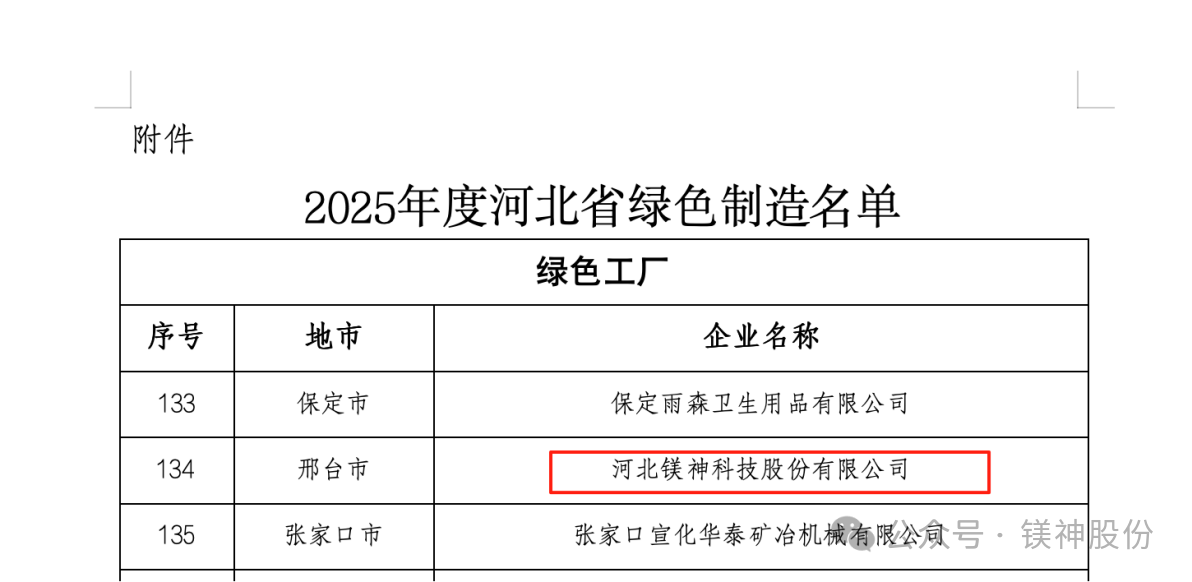 新聞?wù)?2025年9月8日,河北省工業(yè)和信息化廳正式公布了2025年河北省綠色制造名單。河北鎂神科技股份有限公司(以下簡稱“鎂神科技”)憑借在綠色制造、節(jié)能降耗、清潔生產(chǎn)等方面的突出表現(xiàn),成功入選“2025年度河北省綠色制造名單”!這是公司積極踐行綠色發(fā)展理念、扎實推進綠色體系建設(shè)取得的重大成果,也是對鎂神科技綠色制造水平和可持續(xù)發(fā)展能力的認可!