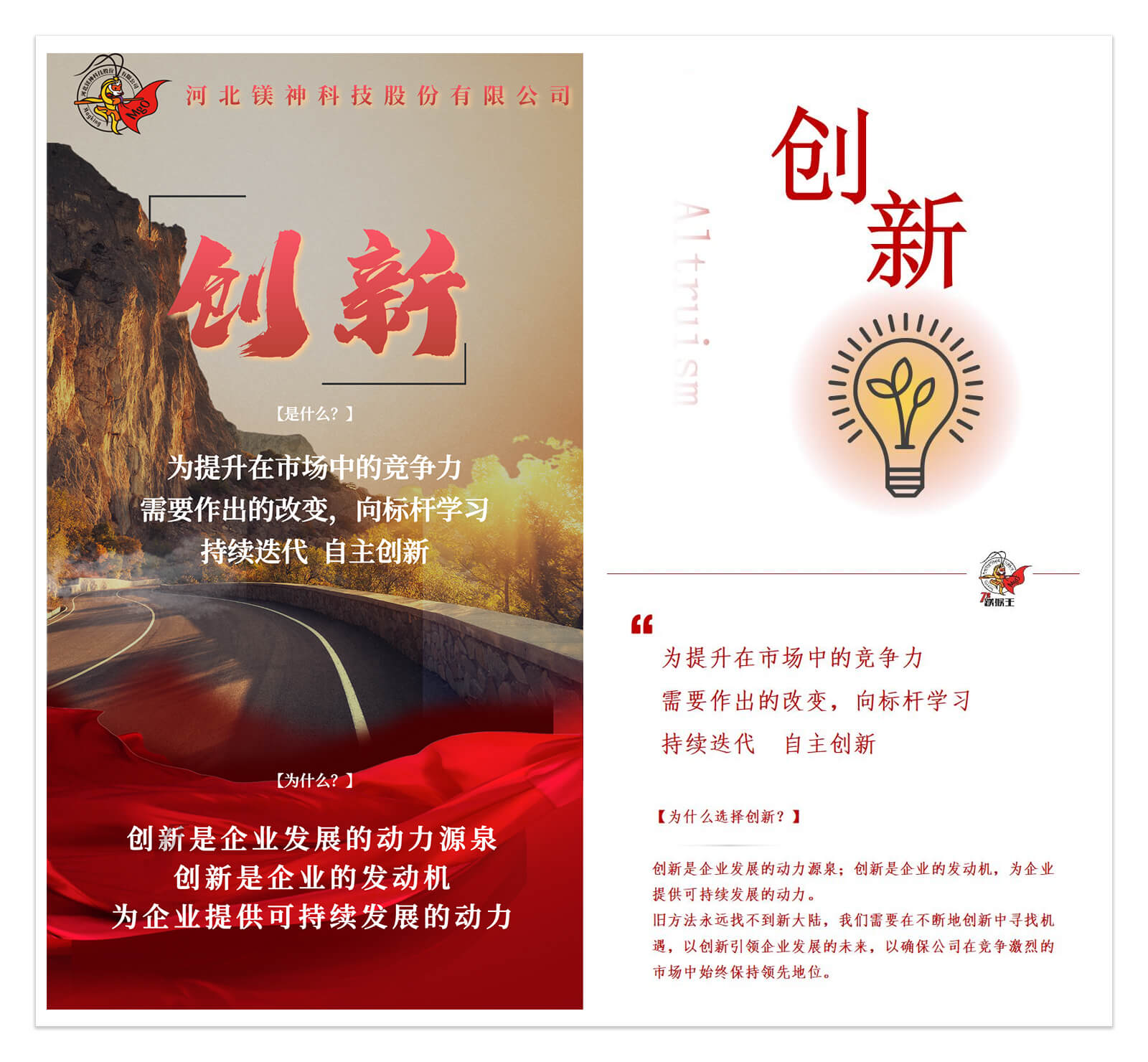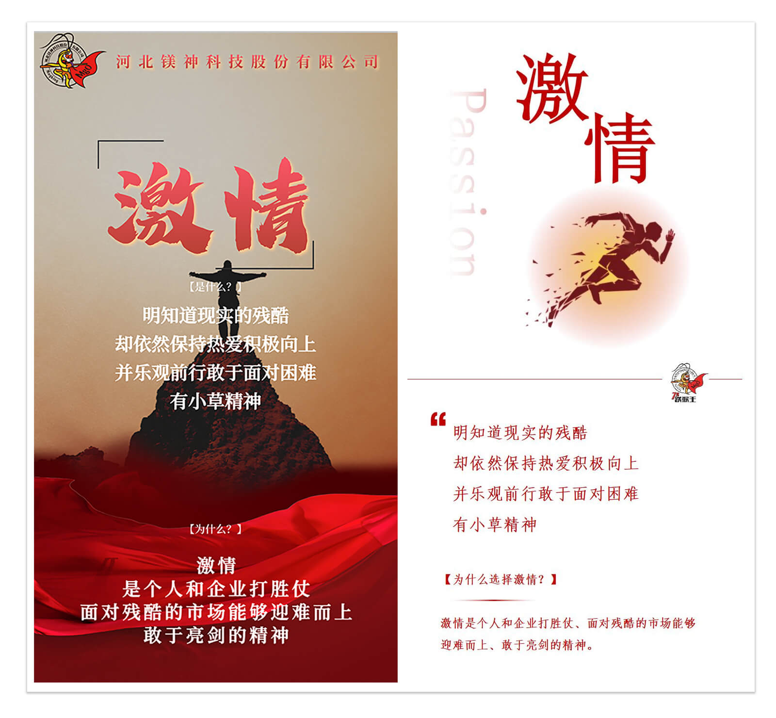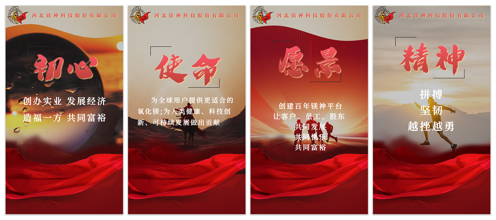 鎂神科技以創(chuàng)辦實(shí)業(yè),發(fā)展經(jīng)濟(jì),造福一方,共同富裕為初心;秉承著為全球用戶提供更適合的氧化鎂,為人類健康、科技創(chuàng)新、可持續(xù)發(fā)展作出貢獻(xiàn)的使命;有著創(chuàng)建百年鎂神平臺,讓客戶、員工、股東共同發(fā)展、共同快樂、共同富裕的美好愿景;培育出拼搏、堅韌、越挫越勇的鎂神人。鎂神人用誠信、激情、夢想、狂學(xué)、內(nèi)省、溝通、合作、創(chuàng)新、利他的價值觀向客戶、社會各界朋友詮釋著鎂神的企業(yè)文化!