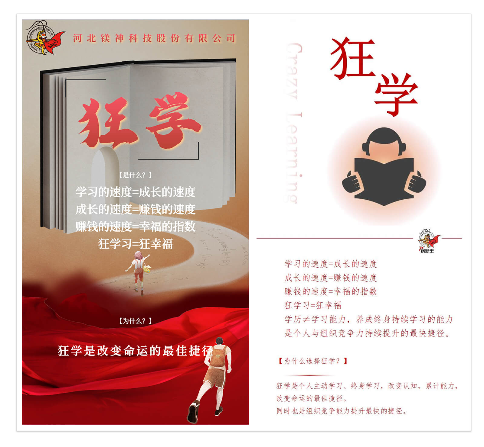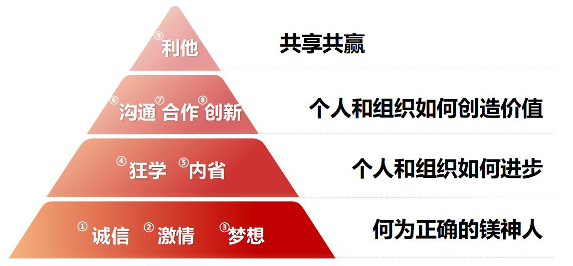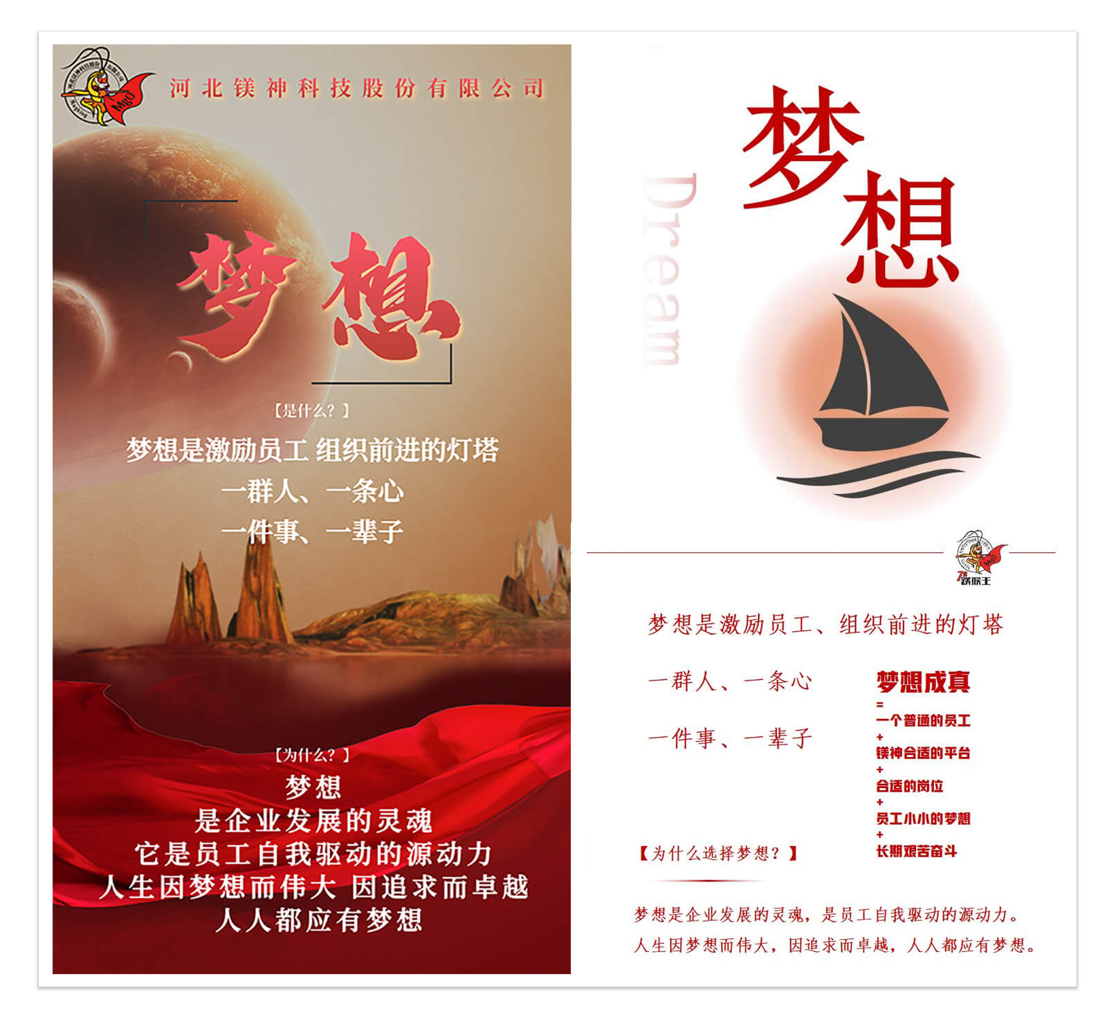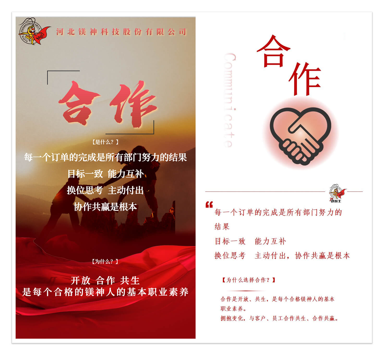 鎂神科技以創(chuàng)辦實(shí)業(yè),發(fā)展經(jīng)濟(jì),造福一方,共同富裕為初心;秉承著為全球用戶提供更適合的氧化鎂,為人類健康、科技創(chuàng)新、可持續(xù)發(fā)展作出貢獻(xiàn)的使命;有著創(chuàng)建百年鎂神平臺,讓客戶、員工、股東共同發(fā)展、共同快樂、共同富裕的美好愿景;培育出拼搏、堅韌、越挫越勇的鎂神人。鎂神人用誠信、激情、夢想、狂學(xué)、內(nèi)省、溝通、合作、創(chuàng)新、利他的價值觀向客戶、社會各界朋友詮釋著鎂神的企業(yè)文化!