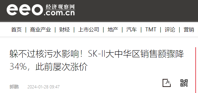 此外,據(jù)日本東電對外公布的計劃顯示,日本福島核電站計劃于2024年排放約5.4萬噸核污水至海洋。這一舉動無疑將對日本的鎂鹽產(chǎn)業(yè)造成更大的沖擊。且市場對日本鎂鹽下游產(chǎn)品反應更加明顯,尤其是在日化這樣廣泛添加鎂鹽又與人們?nèi)粘I蠲芮邢嚓P的領域,市場更加敏感。例如日本的SK-II品牌大中華區(qū)銷售額已驟降34%;資生堂2023年三季度中國市場銷售額下降20%以上。