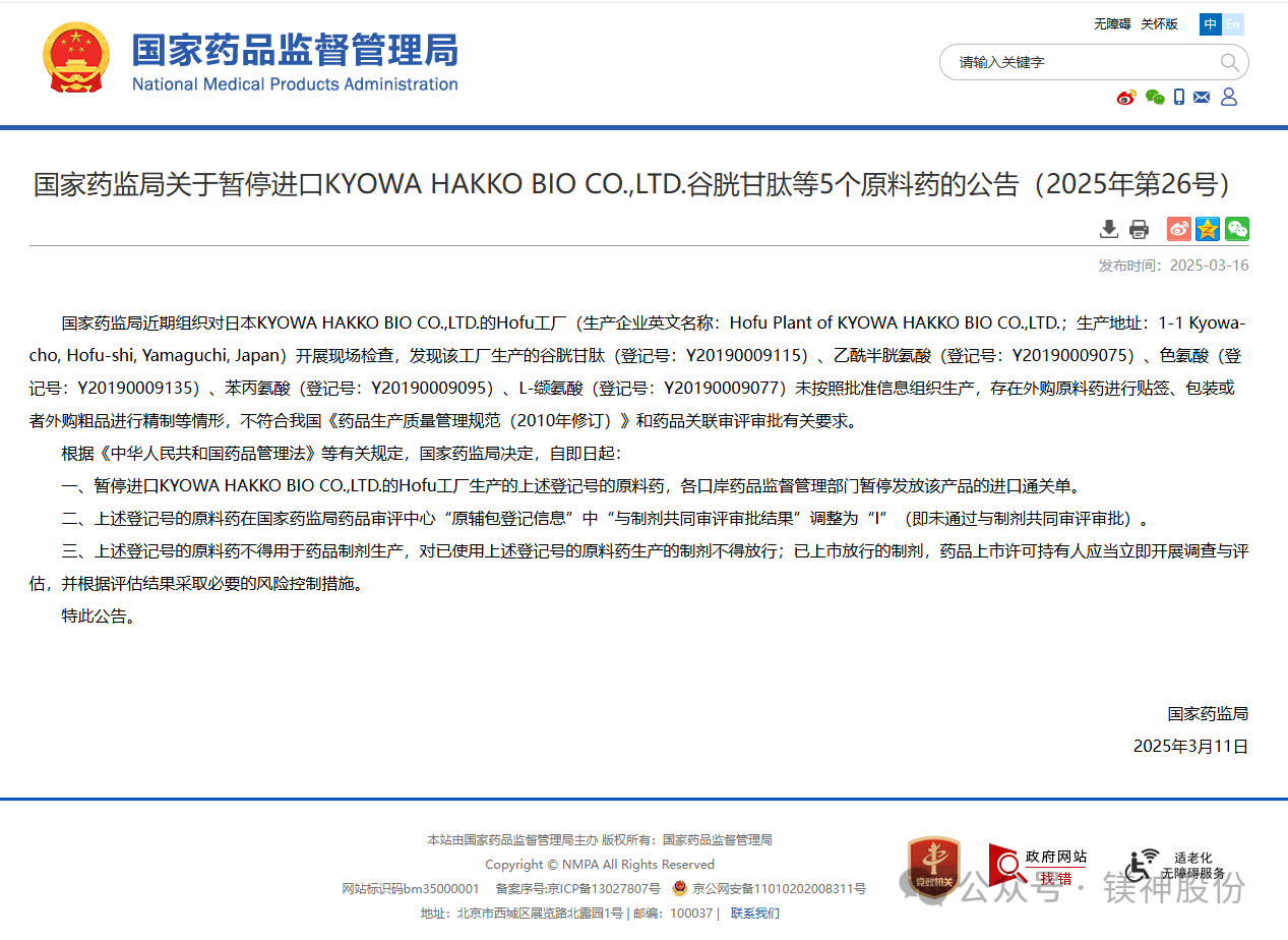 近日,國家藥監(jiān)局發(fā)布重要公告,宣布暫停進口日本KYOWA HAKKO BIO CO.,LTD.(協(xié)和發(fā)酵株式會社)生產(chǎn)的谷胱甘肽等5個原料藥。這一決定源于該公司的Hofu工廠在生產(chǎn)過程中存在未按批準信息組織生產(chǎn)、外購原料藥進行貼簽、包裝或外購粗品進行精制等嚴重違規(guī)行為,不符合我國《藥品生產(chǎn)質量管理規(guī)范(2010年修訂)》及相關審評審批要求。為確保藥品安全與質量,國家藥監(jiān)局已暫停上述原料藥的進口,并對其在藥品制劑中的使用進行了嚴格限制。