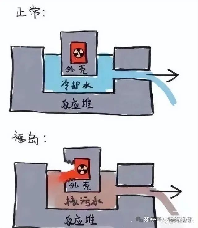 核污水≠核廢水,體現(xiàn)在來源及含輻射物質(zhì)上的不同。