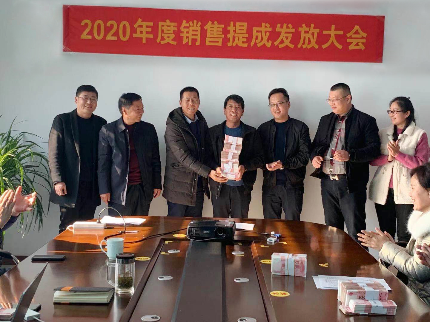 2021年1月2日,上午11點30分左右,河北鎂神科技股份有限公司在會議室召開業(yè)務(wù)員提成發(fā)放大會。一摞摞的紅色人民幣整齊的擺放在桌子上,看著格外的喜慶。業(yè)務(wù)員領(lǐng)到提成現(xiàn)金,大家都喜笑顏開。